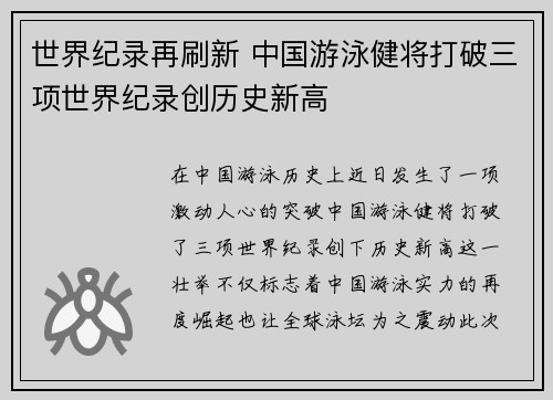 在中国游泳历史上,近日发生了一项激动人心的突破:中国游泳健将打破了三项世界纪录,创下历史新高。这一壮举不仅标志着中国游泳实力的再度崛起,也让全球泳坛为之震动。此次突破的背后,是运动员们数年如一日的坚持训练和不懈追求卓越,也是中国游泳水平和国际影响力的体现。本篇文章将从多个维度对这一突破进行详细分析,包括中国游泳健将的训练历程、世界纪录的创新突破、国内外游泳水平的对比,以及此成就的深远意义。通过这些角度,全面呈现这项突破的重要性和背后故事。