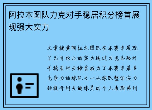 文章摘要:阿拉木图队在本赛季展现了无与伦比的实力,通过力克各路对手稳居积分榜首,成为了本赛季最具竞争力的球队之一。从球队整体实力的提升到关键球员的个人表现,再到战术执行的精准以及教练团队的智慧,阿拉木图队的强大并非偶然。本文将从四个方面详细分析阿拉木图队如何通过稳定发挥、战术创新、个人英雄主义和团队协作,展示了他们强大的竞争力。首先,阿拉木图队的整体实力显现,依赖于他们良好的团队建设与默契配合;其次,战术上的创新和灵活应变是阿拉木图队屡屡获胜的关键;再次,球队中的明星球员凭借卓越的个人能力不断突破,为球队带来了关键胜利;最后,教练团队的深远规划和精准指挥,使得阿拉木图队在激烈的竞争中始终保持领先。通过这些方面的努力,阿拉木图队成功稳居积分榜首,展示了他们强大的实力。